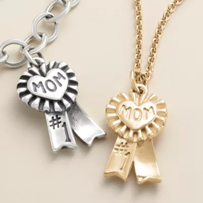 And the blue ribbon goes to… Mom! Award the special woman in your life a prize that tells everyone she’s #1. Available in sterling silver or 14K gold, the Blue Ribbon “Mom” Charm is an engravable rosette for her charm bracelet or changeable necklace.