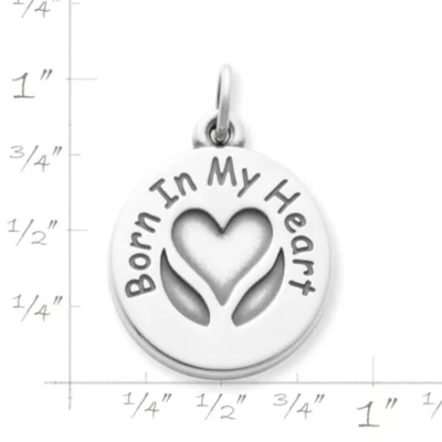 Our adoption charm expresses the love for a precious, longed-for child with the inscription “Born In My Heart.” The centrally placed heart framed by open leaves conveys the growth of a family who adopts a child. The smooth polished back is ideal for a thoughtful, engraved inscription.