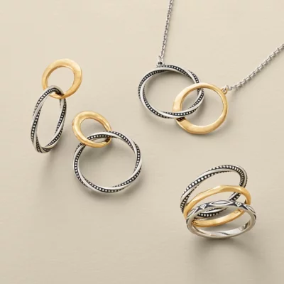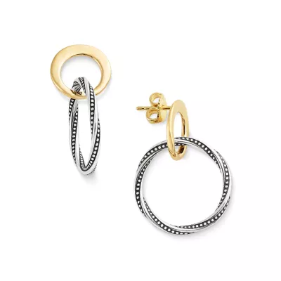 These earrings feature two interconnected circles, commonly known as a symbol for infinity. Crafted in sterling silver with textured beading and lines, the bottom circle gracefully rests beneath the 14K gold ear post accented with a hammered finish. These earrings are versatile for any occasion and can be worn with the matching Connected Circles Necklace.