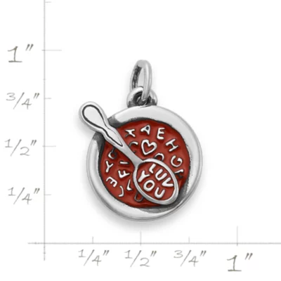 Few things in life evoke a nostalgic, warm and cozy feeling quite like alphabet soup. Commemorate this childhood favorite with a hand-enameled charm featuring sterling silver and vivid red enameling. It pairs well with other food-inspired or enameled designs and can be engraved for added meaning. Don’t miss the sweet message of love on the spoon!
