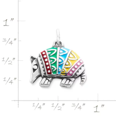 The Enameled Festive Armadillo Charm will saunter its way into your heart. Red, green, blue, yellow and pink bands of hand-applied enamel liven up this already cute, two-sided sterling silver charm. Pairs playfully with our Enamel Pinata Charm and Enamel Festive Donkey Charm.