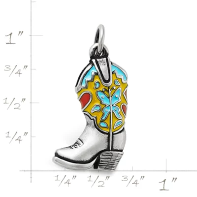 Highlighting the colors and patterns found on traditional western boots, the hand-painted enamel on this sterling silver charm depict colorful butterflies and hearts.