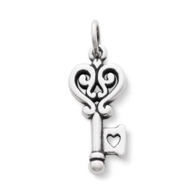 This sterling silver key is lovingly embellished with hearts and scrolls. This charm is an ideal choice for charm bracelets or chains.