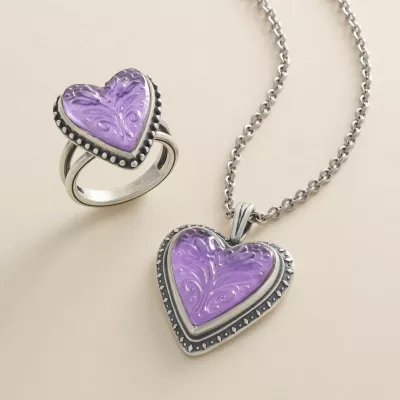- Available in Three 20.1 x 18.6 x 4.5mm Heart-Shaped Tulip Carved Layered Gemstones: Purple Doublet (Lab-Created Amethyst and Mother of Pearl), White Doublet (Lab-Created Clear Quartz and Mother of Pearl) or Blue Triplet (Lab-Created Blue Spinel, Dyed Agate, and Mother of Pearl)