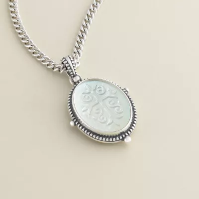 - Available in a 20.25 x 15 x 2.22mm Oval Cross Carved Layered Gemstone: White Doublet (Lab-Created Clear Quartz and Mother of Pearl)