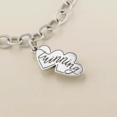From twinning with your best friend to being a parent to actual twins, this sterling silver charm will hold a special place on your bracelet. The design of two hearts together supports the theme while the front features “Twinning” inscribed on the front. The back provides ample space to engrave a message, date or pair of names.
