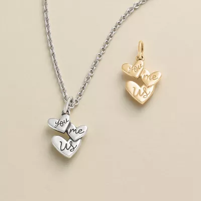 Life will always be better together. These three hearts stack to create a little charm that says, “you, me, us.” Make yours even more personal with an engraving on the back. Available in sterling silver or 14k gold.